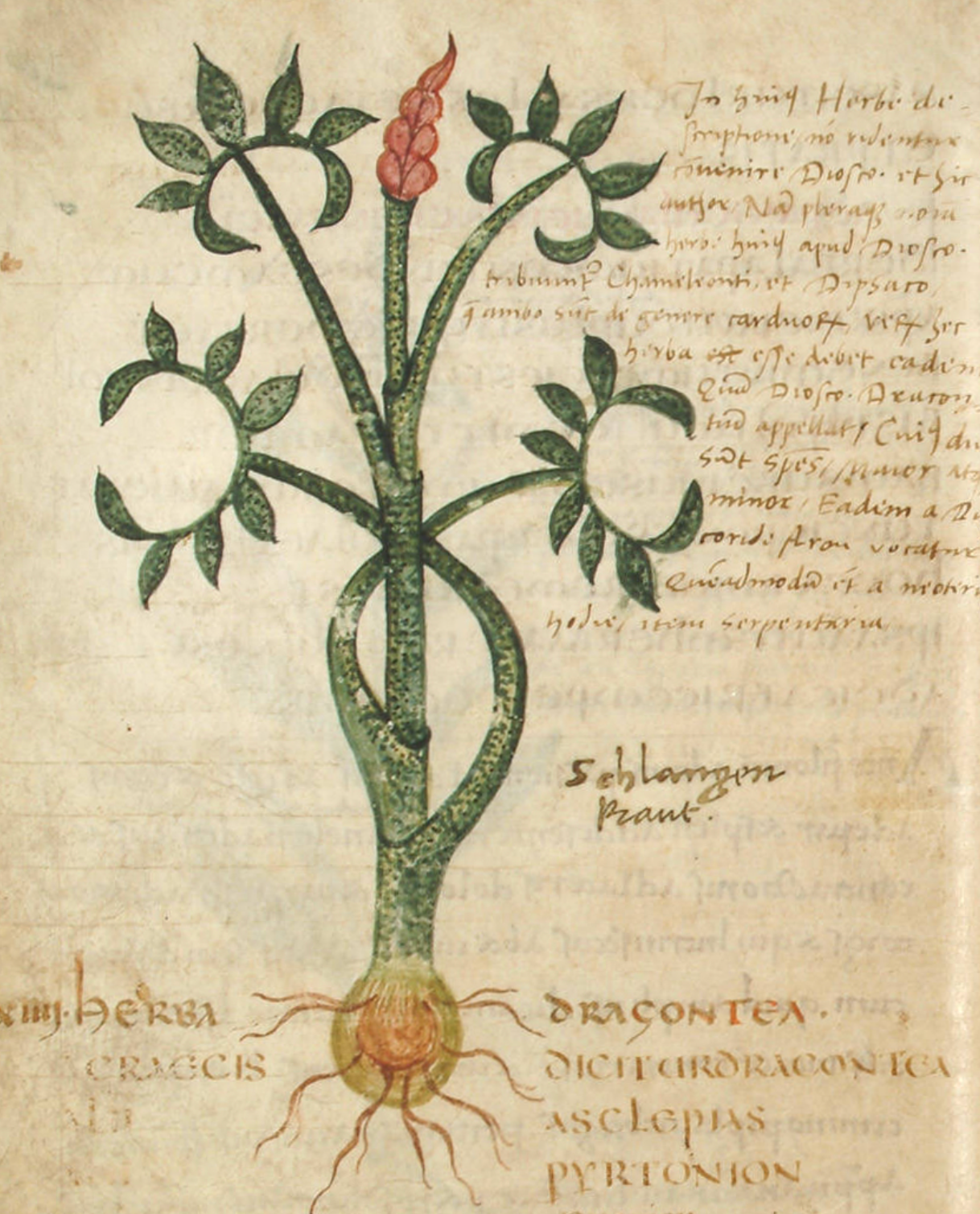The first printed edition of Herbarium Apulei contains 131 woodcuts of plants, including lists synonyms for each plant in Greek, Persian, Egyptian, and other languages, illustrating each with a stylized woodcut.