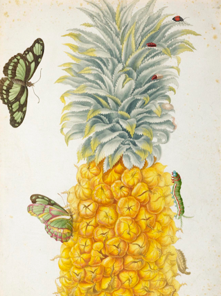 “There is no nobler piece of fruit than the pineapple,” wrote the Dutch physician Jacob Bontius in 1629 after tasting the pineapple in Batavia. Soon after, the pineapple became the symbol of the new world and the Golden Age in the Netherlands. A competition arose to see who was the first to grow pineapples in Europe, which Agnes Block won. An acquaintance at the Leiden Hortus gave her a cutting of a pineapple plant imported from Suriname. After much patience and attention, a full-fledged pineapple grew in her greenhouse in 1685, which she donated to the states of Utrecht. An exceptional achievement for a woman at that time. She grew more plants that she had drawn by Maria Sibylla Merian, Alida Withoos, Otto Marseus, Maria Monickx van Schriek and Johannes Bronckhorst, among others, with which she financially supported the development of botanical art.